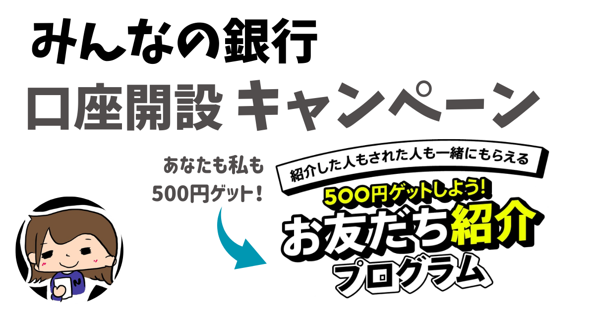 節約・お得情報【簡単】みんなの銀行口座開設で紹介コード入力して500円ゲット! お金が欲しいなら、口座開設キャンペーンを狙お!なつこです、「みんなの銀行」の口座開設。紹介コードを入力して口座開設をすると、紹介した人も、紹介された人も500円がもらえちゃう。しかも、翌日に!!!!!嬉現在、金欠の人はすぐやるべき事案ですね... 2021.06.11 2025.09.10節約・お得情報お小遣い稼ぎ借金返済生活